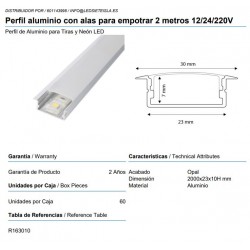 Perfil aluminio con alas para empotrar 2 metros 12/24/220V